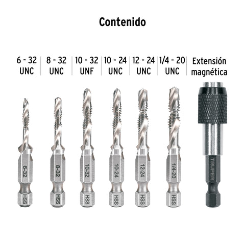 Juego de 6 brocas HSS con machuelo para metal, Truper | JBMT-6 | 102335
