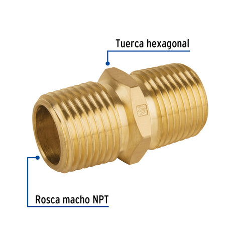 Niple unión NPT de latón, 1/2' con tuerca hexagonal, FOSET | CLG-666 | 48499