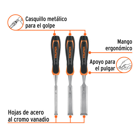 Juego de 3 formones mango Comfort Grip, Truper | JFT-3 | 17759