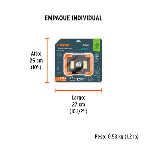 Lámpara LED 1000 lm de trabajo, recargable, TRUPER | LAT-1300 | 14631