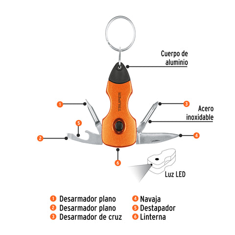 Multiherramienta 6 funciones, con LED, tipo llavero, Truper | NAMU-LL | 13336