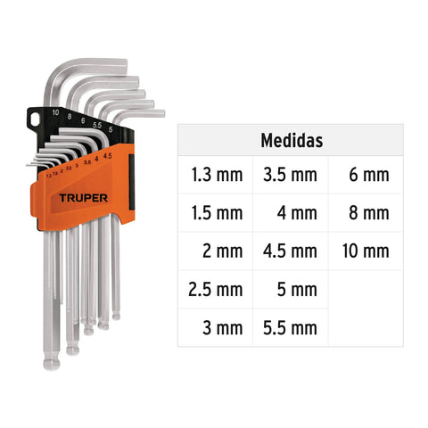 Juego 10 llaves allen largas mm punta bola con organizador | ALLX-10M | 13644