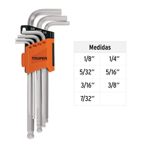 Herramientas especializadas para tornillos hexagonales y de estrella. Incluye llaves Allen métricas e imperiales, llaves Torx y juegos completos en diferentes tamaños para trabajos de precisión en mecánica, electrónica y ensamble de muebles, disponibles en el catálogo Truper.