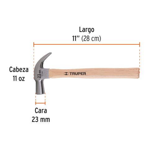 Martillo cabeza cónica 23 mm uña curva, mango madera, TRUPER | MAC-23 | 10557