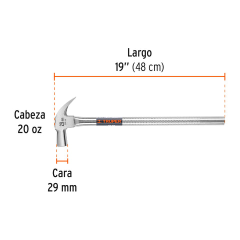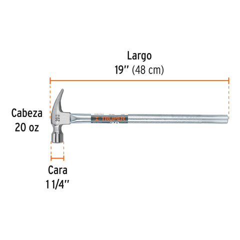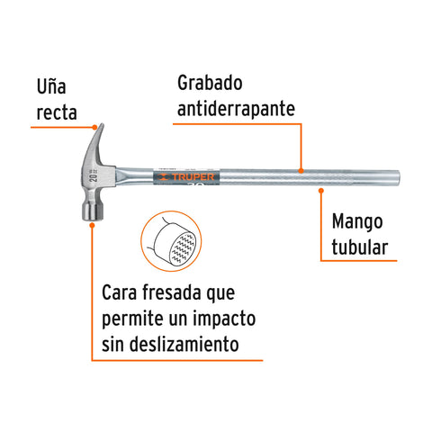 Martillo tubular pulido 20oz cara fresada, uña recta, Truper | MTR-20F | 16704