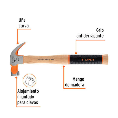 Martillo pulido 7 oz uña curva, mango hickory, Truper Grip | MO-7 | 16650
