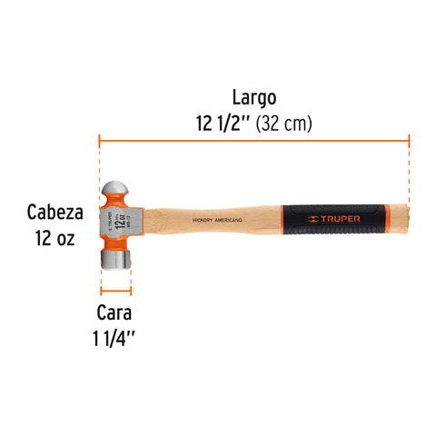 Martillo pulido de bola 12 oz mango hickory, Truper Grip | MB-12 | 16901