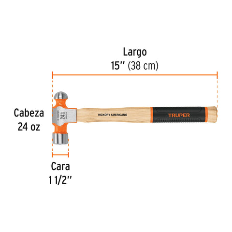Martillo pulido de bola 24 oz mango hickory, Truper Grip | MB-24 | 16903