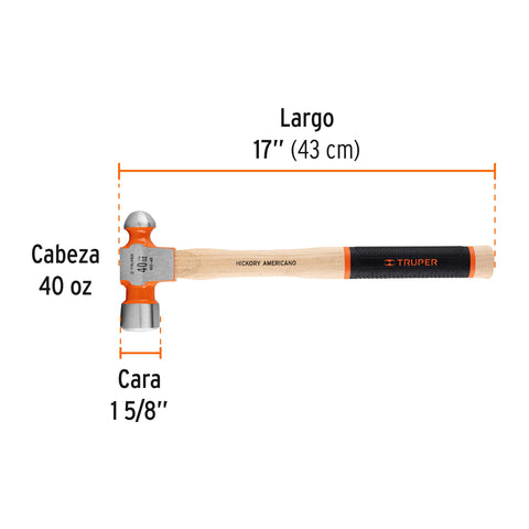 Martillo pulido de bola 40 oz mango hickory, Truper Grip | MB-40 | 16905