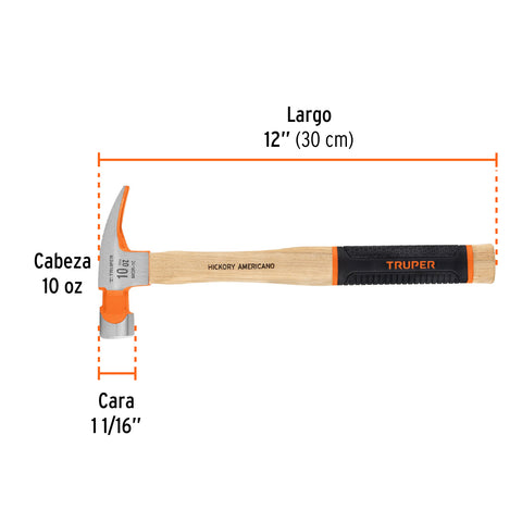 Martillo pulido 10 oz uña recta, mango hickory, Truper Grip | MOR-10 | 19711