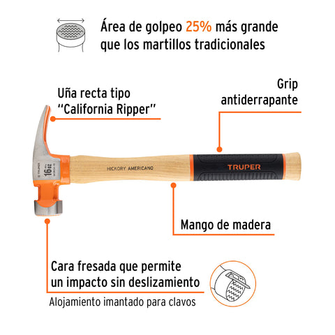 Martillo 16 oz uña recta tipo California Ripper, Truper Grip | MORCA-16 | 19989
