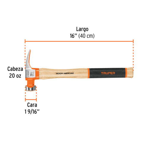 Martillo pulido 20 oz uña curva, mango hickory, Truper Grip | MO-20 | 16656